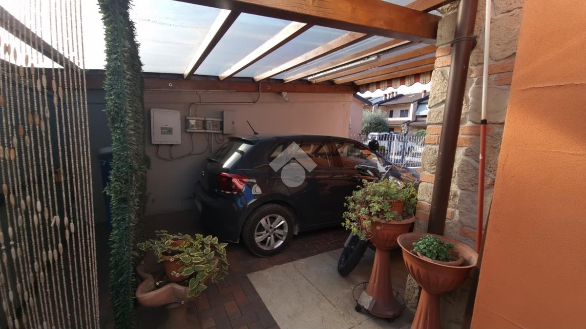 Dal cancello si accede all'area esterna privata, interamente piastrellata, con posto auto coperto da tettoia. Il piano principale accoglie un soggiorno con angolo cottura valorizzato dalle calde travi a vista. Una porta finestra si apre sull'area esterna esposta a sud, dove una gradevole veranda con camino permette di vivere l'esterno in ogni stagione.